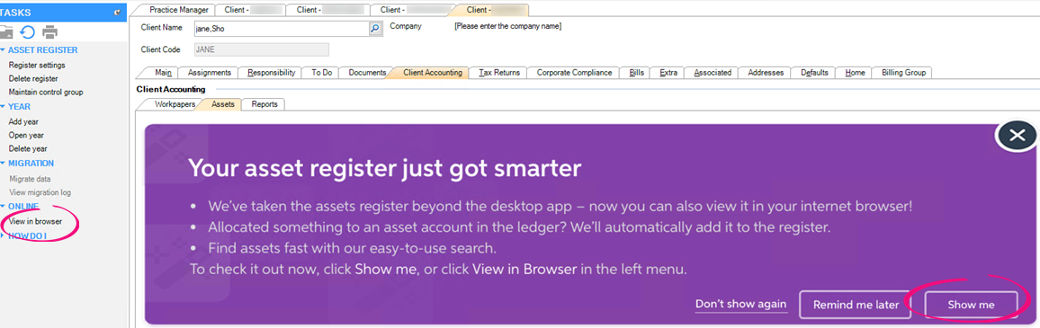 Remind me later—closes the banner for the current session. The banner will re-appear if the same client is re-opened