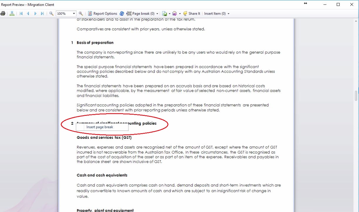 To insert a page break, go to where you would like to insert a page break, right click on the note header and select Insert page break.