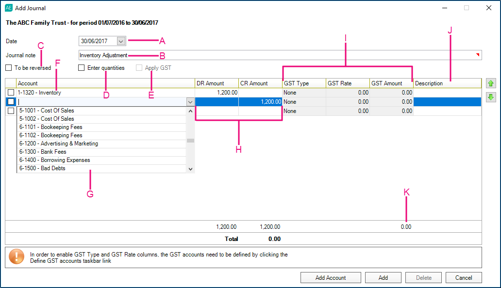 Where your DR and CR amounts aren't aligned, this field will display the difference between total debits and total credits.