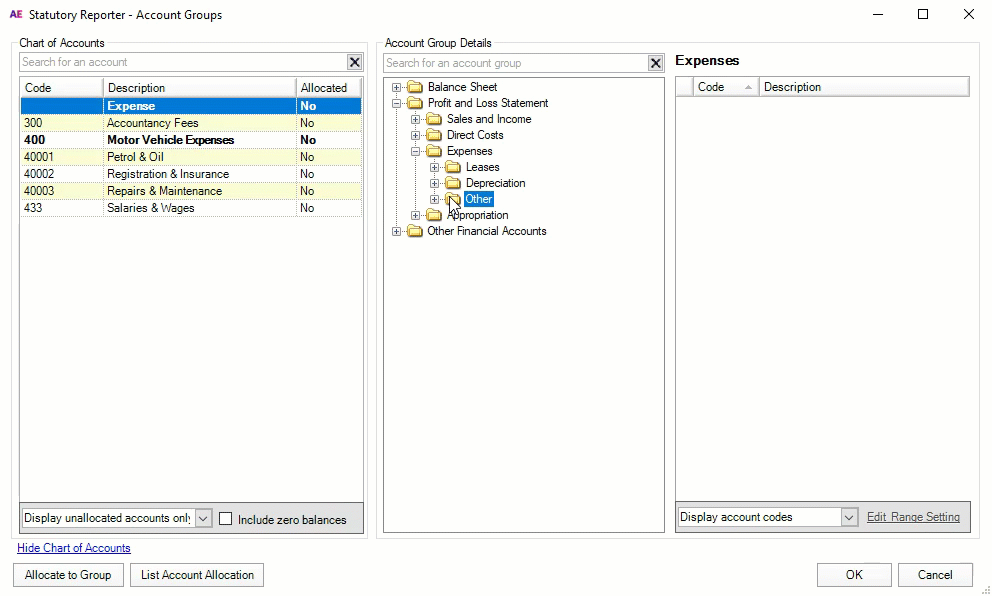 Statutory Reporter comes with a set of default account group allocations. If you want, you can edit these defaults.