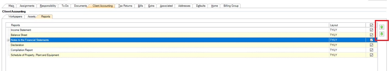 The order of the reports in the Default Report Selections table determines the report order for all clients of that entity type. The report order can also be modified on a client-by-client basis if necessary. See Previewing financial statements.