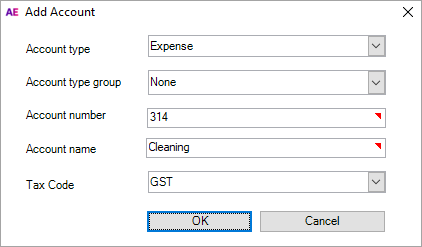 The Account name, Account type and Balance are updated automatically. Repeat this step for each account code.