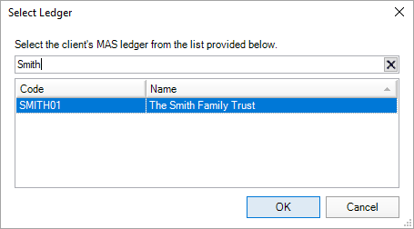 You can search for a MAS, Accounts or AO Classic general ledger by entering the ledger code or, part of the ledger name.