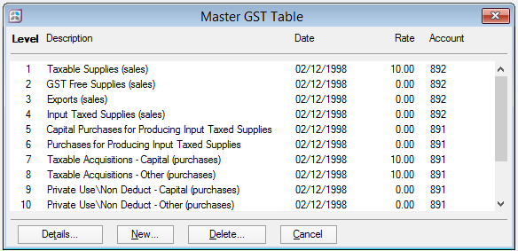 In the Master GST Table, add or edit the GST rates. GST levels 1–14 are usually MYOB defaults.