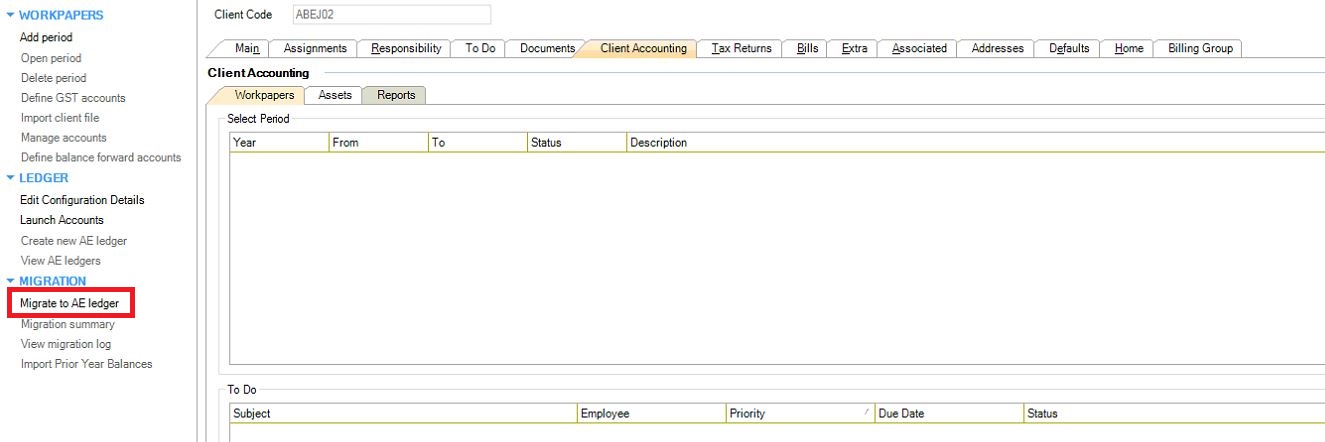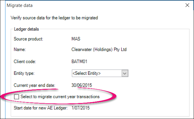 On the TASKS bar, click Migrate to AE ledger or Migrate to AO ledger. The Migrate data window appears. Most details are automatically retrieved from your existing ledger but there are some options you can change:
