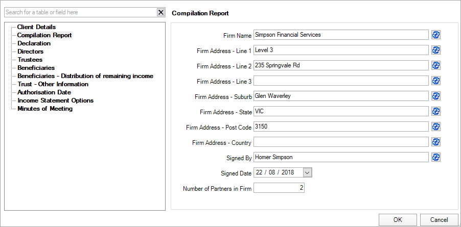 Click on one of the categories in the left-hand pane to enter data in the relevant fields. For example, Compilation report.