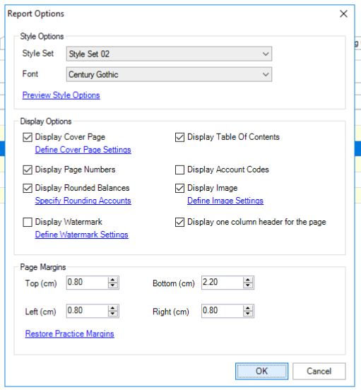 | Display options | Options to display cover page, page numbers, rounded balances, watermarks, logos, table of contents, account codes or display one column header. |