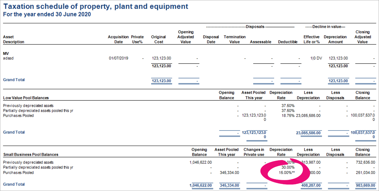 In the Taxation Schedule of property, plant and equipment report, you'll see ** next to depreciation rate for purchases pooled. This is part of an upcoming feature and currently has no impact on the rates.