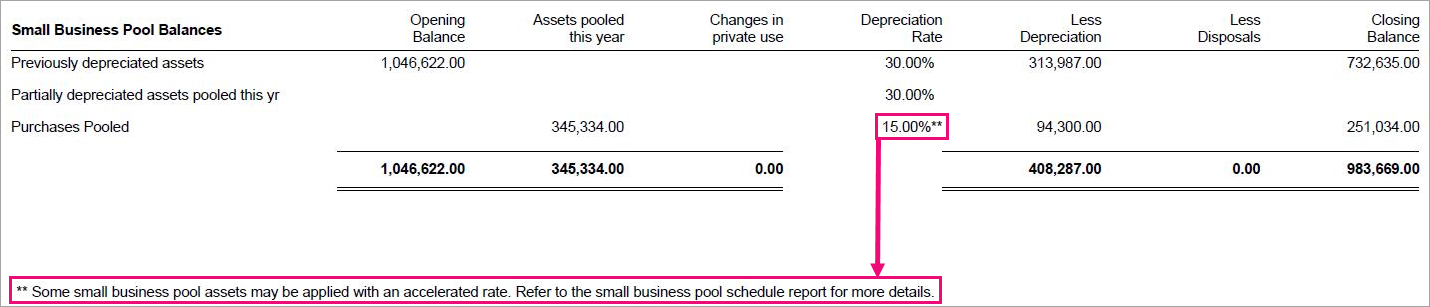 In the Full Schedule Report and Tax Schedule Report, you'll see a note about an accelerated rate. This reminder appears in the reports whether or not you're using the accelerated rate.