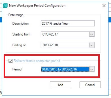 When creating a new period, you have the option of rolling over the previous period. You can rollover individual workpapers from a previous period into the current period. You may want to do this if a workpaper is not automatically rolled over from the previous period, or if you made an error and want to use previous data.