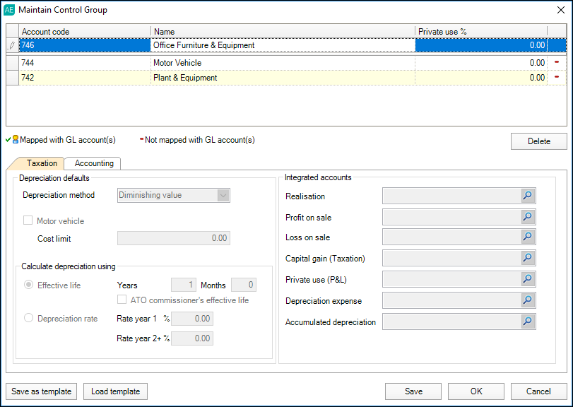 If applicable, you can tick the Motor vehicle checkbox to apply the ATO cost limit to all motor vehicles allocated to the control group. This is best if you have purchased multiple motor vehicles in the same financial year. You can look up the cost limit on the ATO website: Car cost limit for depreciation.