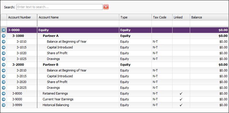Open the AccountRight or Essentials company file and set up equity accounts for each partner. For example: