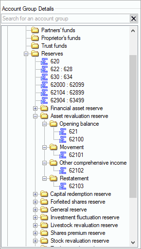 As part of the SDS changes, we've expanded the Account Group structure in the Reserves, Shareholder funds & Other folders to include a folder for every Reserve type (under Reserves) and the different Share types (shareholder funds) and for Other (any additional equity items). You'll find 4 subfolders under each Reserve type, Share type, and Other.