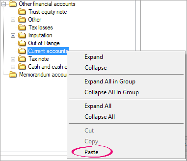 Right-click on the Current accounts folder and choose Paste. The shareholder accounts appear in the Current accounts account group details.