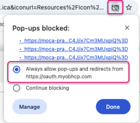 Go to your browser settings > Privacy and Security and add https://myobhcp.com to the pop-ups allowed list.