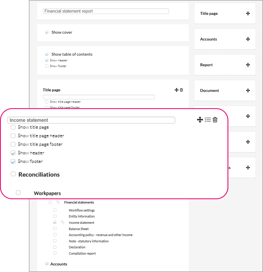 You can show or hide the pages or reorder the reports by dragging and dropping.