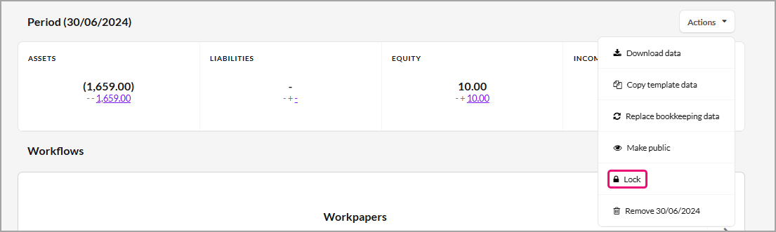 Once you’ve finished all the accounting work for the client, go to the Actions menu and select Lock from the drop-down.