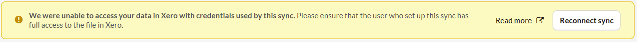 Make sure to check the error message is redirecting to check your details in the underlying bookkeeping system such as losing access to the file.Error - We were unable to access your data with <bookkeeping system> with credentials used by this sync. Please ensure that the user who set up this sync has full access to the file in <bookkeeping system>