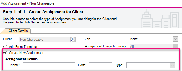 Click into the new record row Click here to add new... The Create Assignment for Client screen appears.