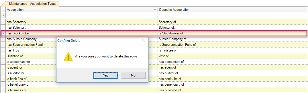 Click the row containing the association type you want to delete. Click to highlight the entire row.