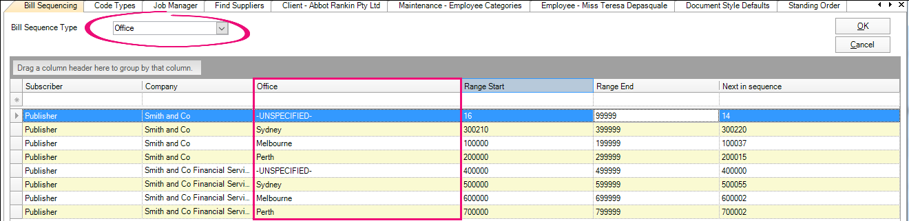 Enter the BillSequenceType value, for example, Company, Office, Department or Partner that is relevant for your practice.