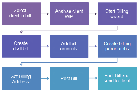 There are a number of steps to be completed when raising a bill for a client. The diagram below provides an overview of the workflow for creating a bill which is generated by using the Billing Wizard.