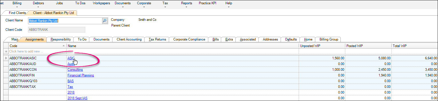 Highlight the relevant assignment and click on the Name hyperlink to open the record. The Main tab opens.