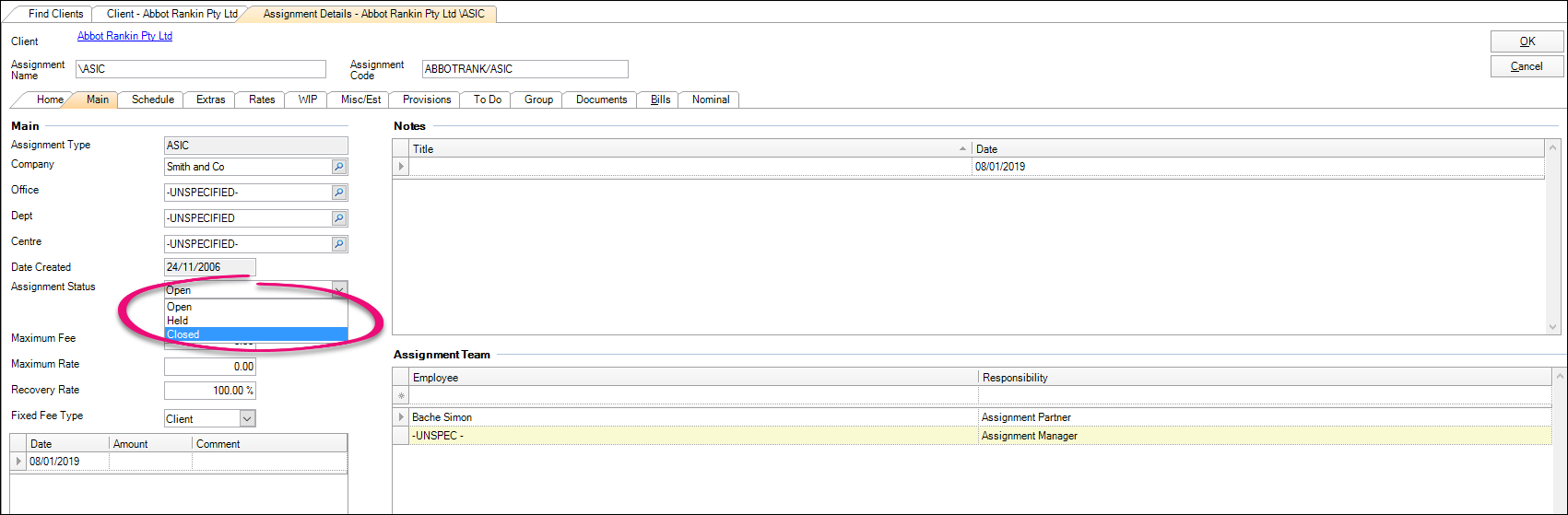 To do this you need to make sure any outstanding WIP entries are fully billed or written off. You can then open the assignment and on the Main tab change the Assignment Status to Closed.
