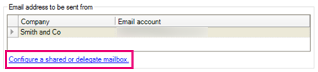 Click the Configure a shared or delegate mailbox link to open the configuration window. The table in this window contains a list of manually-configured shared mailboxes that you can use in the Email account to be sent from section.