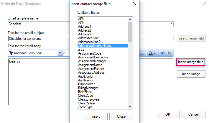 Click the Insert merge field button. The Insert contact merge field window opens.