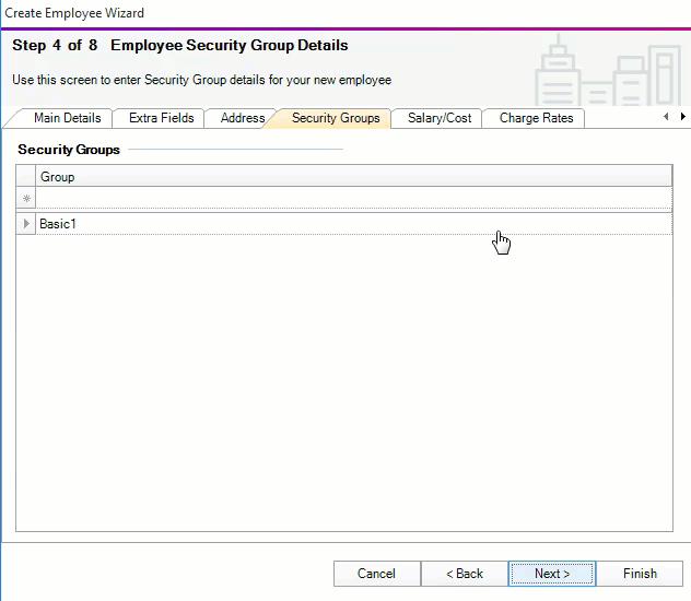 Click Next. This information transfers to the Employee page > Security Groups tab.