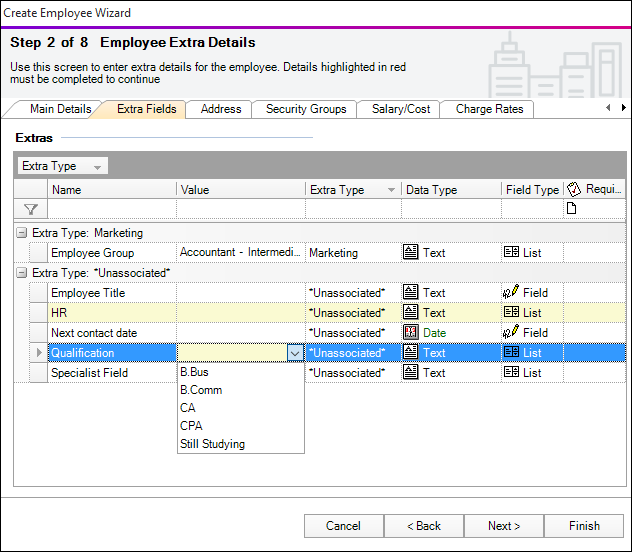 Click Next. This information transfers to the Employee page > Extras tab from where you can amend it later on.