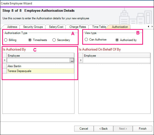 If the employee can correct their posted timesheets, you'll need to update the Authorisation tab once you click Finish. Change the Authorisation type to Timesheets. Under the Can Authorise section, search for and add the new employee.