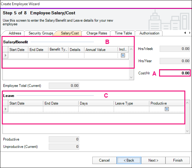 Use the Employee Salary/Cost tab to record salary, benefits and leave details for an employee.