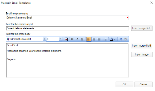 Debtor statements are emailed to your clients using the mail merge functionality. MYOB provides sample templates for you to use and customise for your practice. For more information on how to modify the sample templates, refer to Emailing Debtor Statements using Practice Manager.