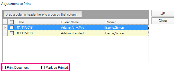 Click the checkbox to select one or more Date/Client Name combinations or the checkbox in the column heading to select all listed adjustments.