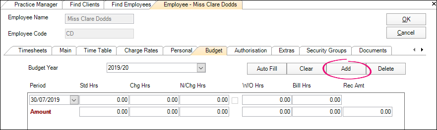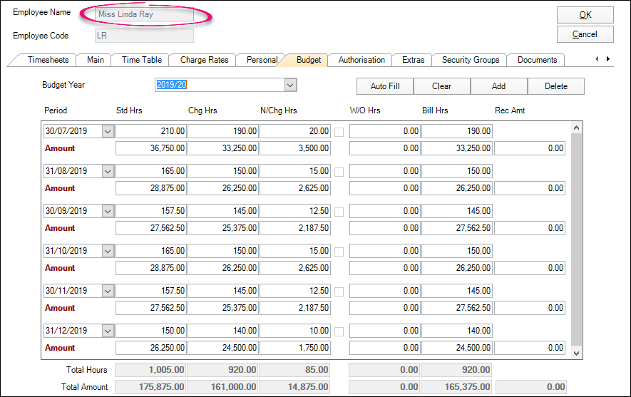 Employee budgets can be set up for each employee so you can track actual chargeable time against budgeted chargeable time. In some cases, you may want to budget billable time, which you can also enter. Employee budgets can be setup on each employee individually or can be auto filled based on the employee category they're linked to.