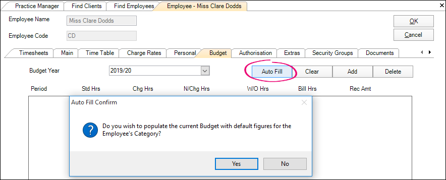 Select Auto Fill. A message Do you wish to populate the current Budget with default figures for the Employee's Category? appears.