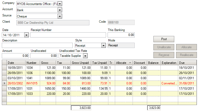 If the receipt is being allocated to a single invoice, double-click in the Allocate column for that invoice to enter the amount automatically.