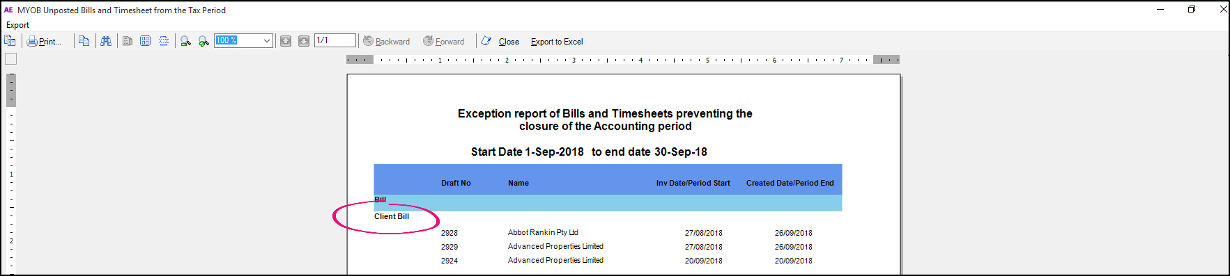 In MYOB Practice Manager, you cannot close off an accounting period if there are any unposted entries such as bills for the period you are attempting to close.
