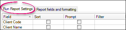 In a new report, once you have added your fields, click the Run Report Settings tab.