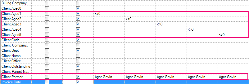 Continue typing <>0 in the Or columns in a stepped formation for the remaining Client Aged fields, as shown below: