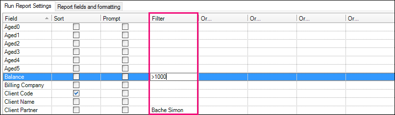 A blank field | Enter the value you want to filter on and click OK. For example, to select all billed amounts greater than $1000, type: >1000. |