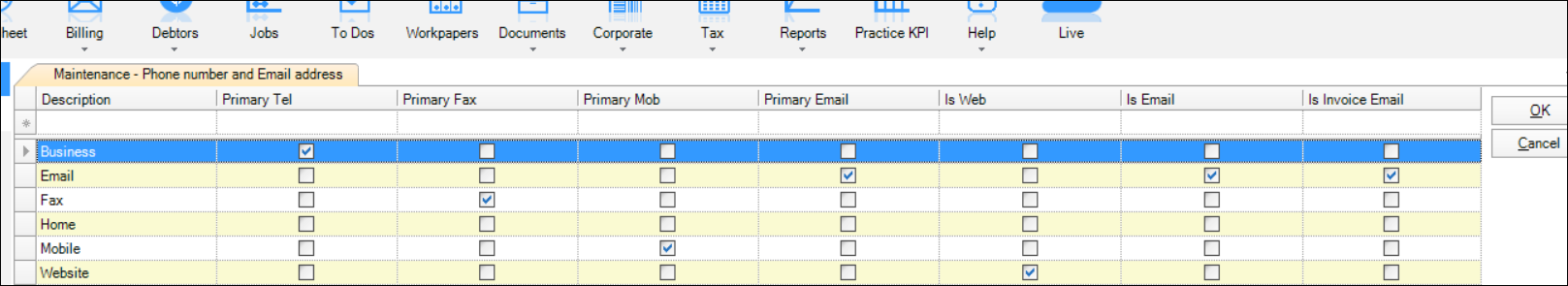 Only one checkbox can be selected per column. While you cannot have more than one Primary Tel, Primary Mob or Primary Email, the same Description can be defined as the Primary Tel and Primary Fax. Clients can only have one Invoice Email and one Tax Email (New Zealand).