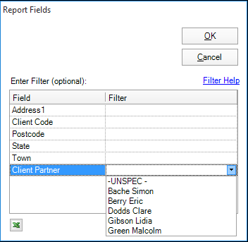 There are various options for entering a value for a filter, depending on the type of data required. If a drop-down list or ellipse button is displayed, you select a value from the choices offered, otherwise type in a valid value or formula.