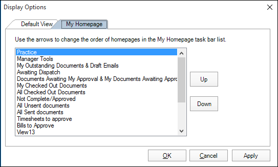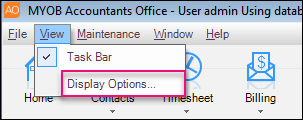 MYOB AE allows each user to set their default homepage view. The Display Options window is used to select one of your standard homepage views, one of your customised My Homepage views or another view such as Find Contacts or Find Clients, as the first page. You can also re-order the list of your customised homepages that are available on the Home drop-down menu on the toolbar.