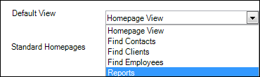 Select the appropriate Standard Homepage from the drop-down that will be the default view. You can choose from the following views, based on your licensed product set: