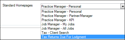 Under Standard Homepages, you can select Practice Manager - Personal for accounting staff (which will give them access to their timesheets (AE) as well as productivity graphs and budget graphs) or select Practice Manager - Partner/Manager for partners and/or managers (to be able to view their top 10, bills to approve (AE) as well as aged WIP and aged debt graphs.)