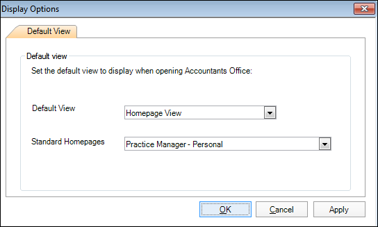 In MYOB AO, the Display Options window only contains the Default View tab. You can choose one of the following to be displayed when you log in:
