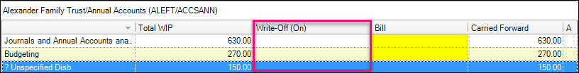 If the bill amount is greater than the WIP balance on the assignment/job, the write–on amount is calculated automatically.